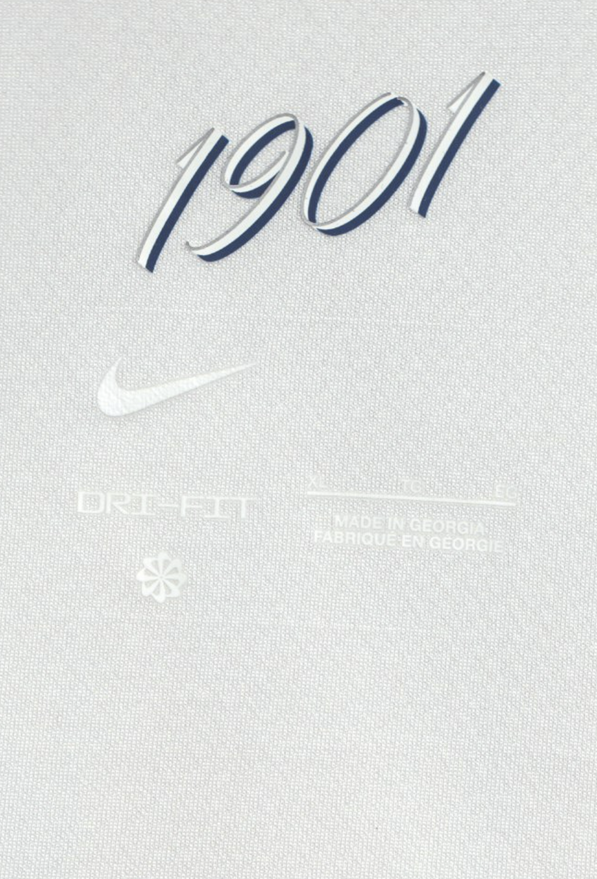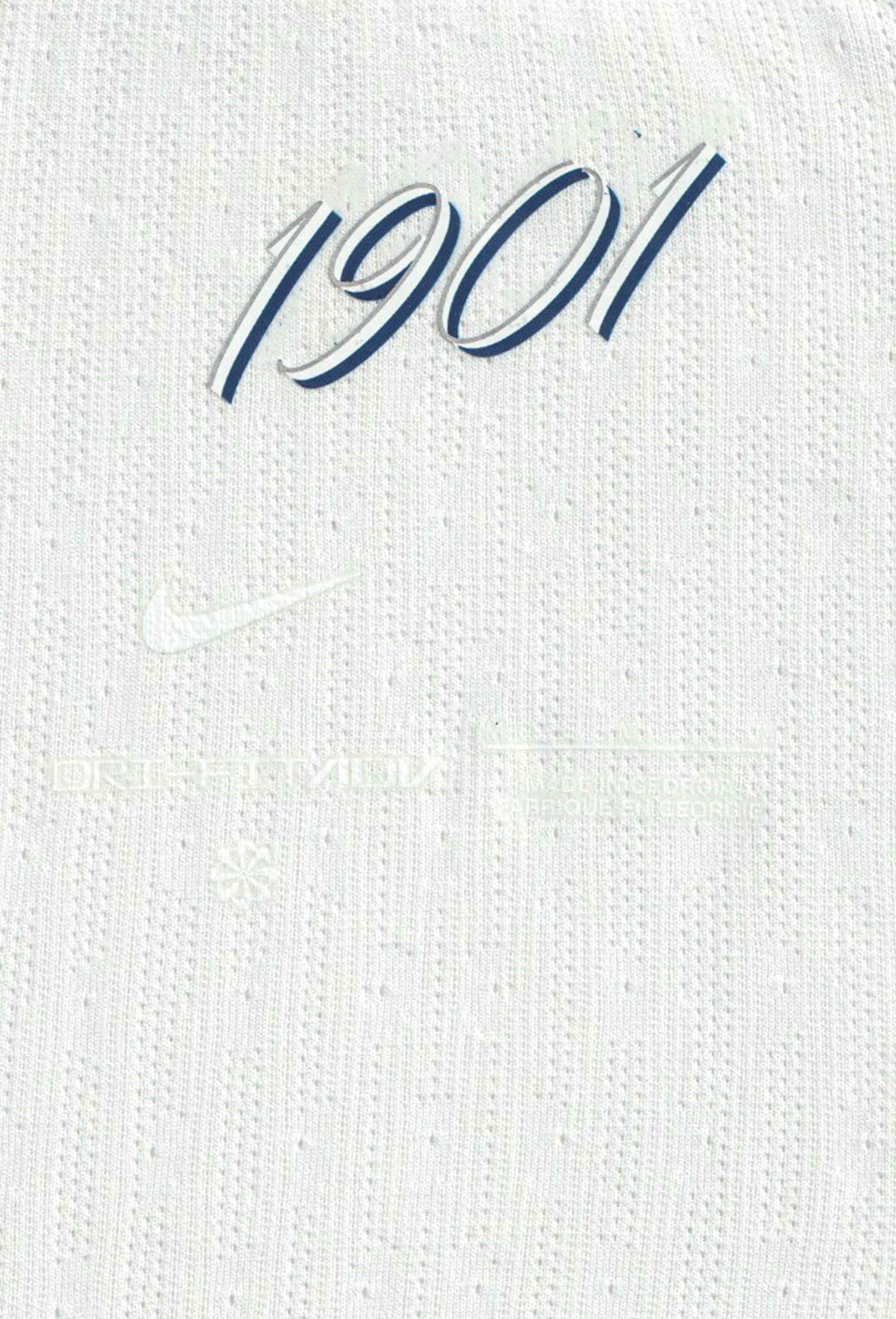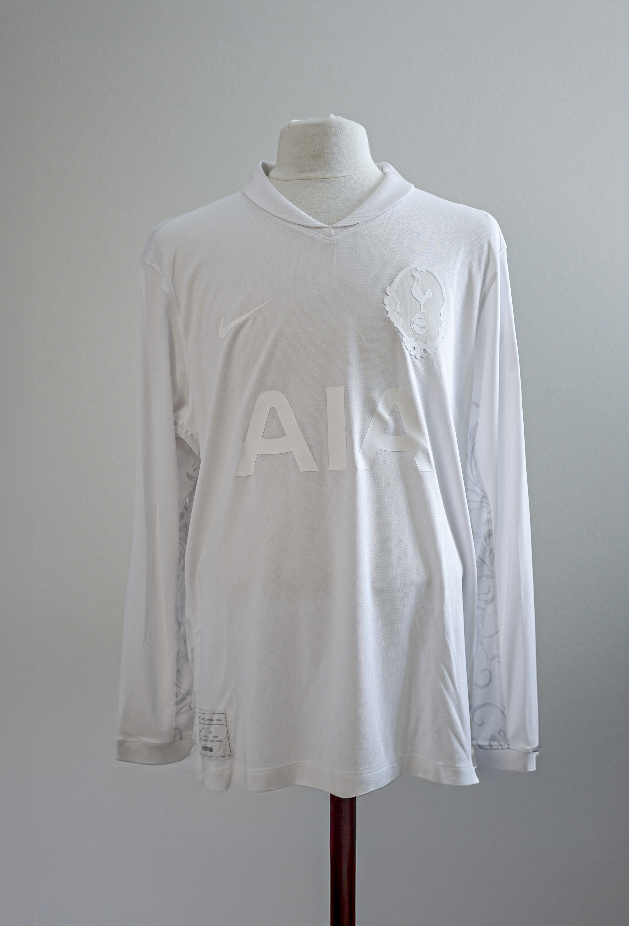 On January 10, 2026, to mark the 125th anniversary, Tottenham wore a commemorative kit against Aston Villa in the third round of the FA Cup. A dead-straight homage to the original. All white, long sleeves, white AIA logo, no surnames, only numbers. The modern crest swapped for a heritage crest. Every marking — sponsor, Swoosh, Kraken sleeve patch — was rendered in tonal Lilywhite. A square patch carried the surnames of the 1901 eleven and the date of the final. Nike put out a short film, Carved From Our History, built around a marble sculpture of the shirt by the Scottish artist Alasdair Thomson.